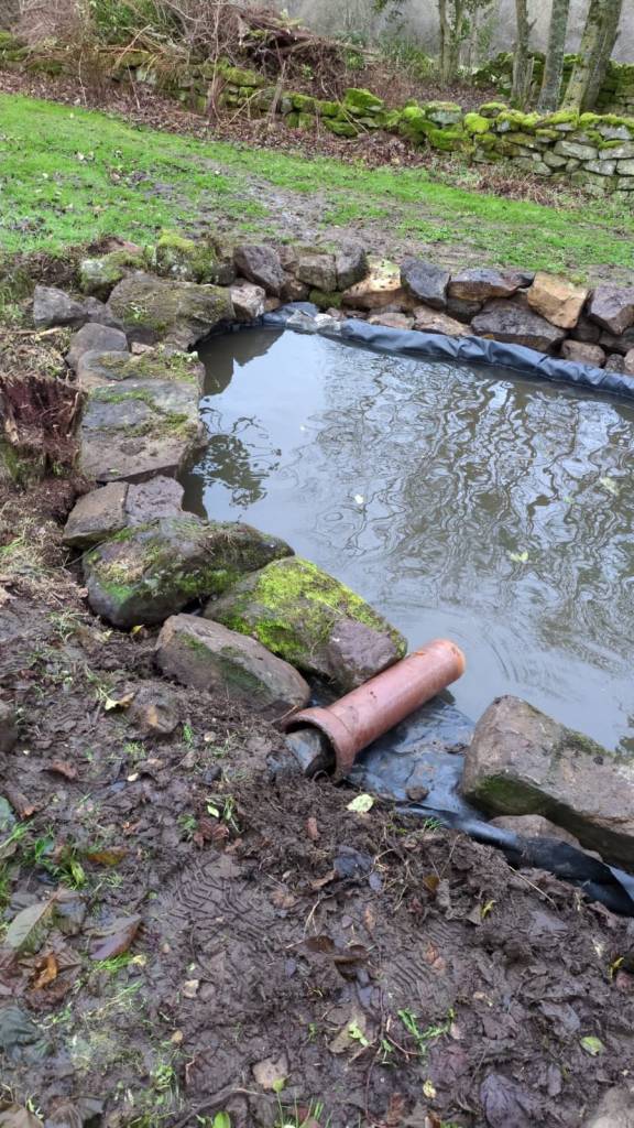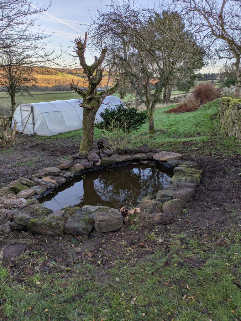 Ten years of “leaving it alone” and we decided it was time to clean it out. Probably took out a ton of sludge with the mini digger – unfortunately in the process of doing this we managed to puncture the liner so we had to lay a new one. At least it’s all set for the coming spring.